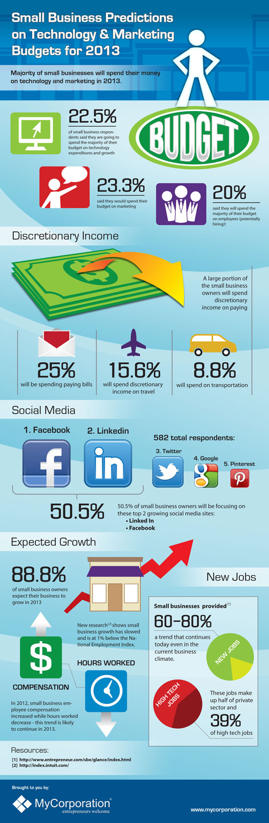Budget: When asked about their budgetary plans for the year 2013, the majority of small business owners indicated that they plan to spend their money primarily on technology and marketing. Specifically, within the survey 22.5 percent of respondents indicated that they were going to spend most of their budget resources on technology expenditures and growth, while 23.3 percent planned to focus their resources on marketing efforts. Additionally, 20 percent responded that they planned to spend the majority of their budget on employees, compensation, and even potential hiring (which bodes well for the job market as well).