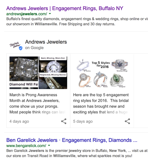 Dubbed Google Local Business Cards by some of the Watchers, you can see what the stir is about in this search return for “jewelers Williamsville NY”. Lucky Andrews Jewelers gets an eye-catching treatment with Twitter- or Facebook-like posts. These posts or cards are shareable on major social networks. Click on a post and you arrive at a page that lives on Google itself at “posts.google.com” not another site.