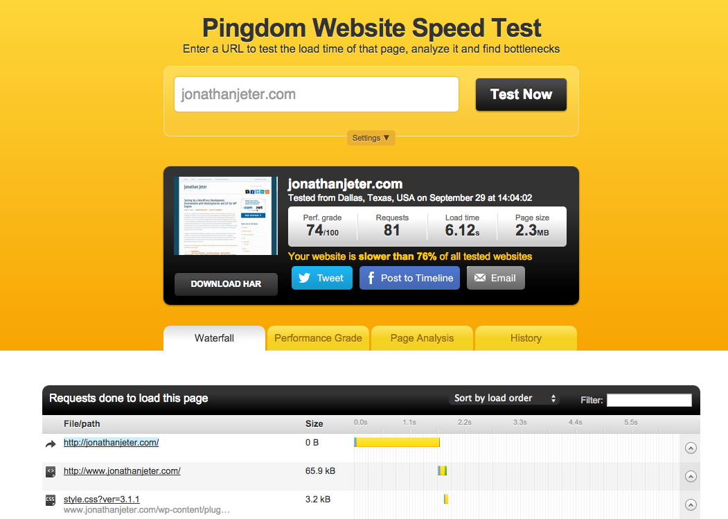 How can you tell if your website is optimized? There are several good websites that will test your website to see how it performs. My favorite is the Pingdom Website Speed Test. Simply type the URL of your website into the form and Pingdom will download the page through their tool. For each component on the page, it will let you know how long it takes to connect to the server to find the resource and how long it takes to download. Under the performance grade tab, you will see the different elements that make up the performance grade and how your site scored for each one. The page analysis tab breaks down the different types of elements on the page and lets you know very specifically how all of the different aspects of your page are performing. Finally, it allows you to keep a history of tests so you can see performance over time.