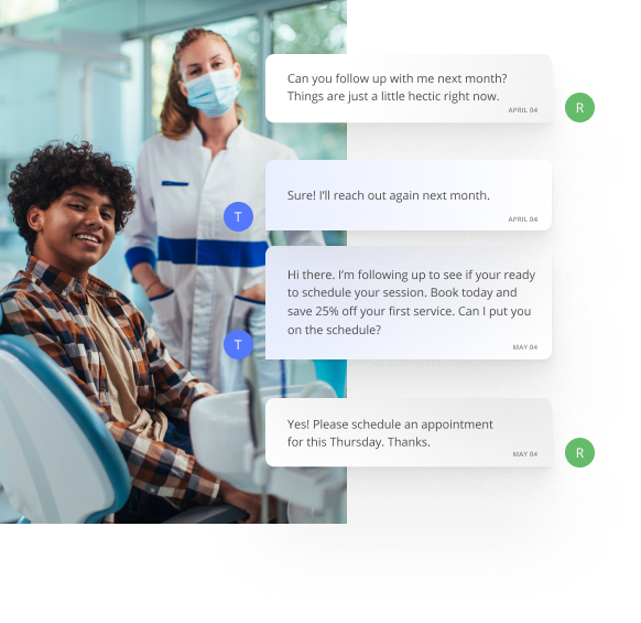 Deliver fast updates and reminders to your patients via text and email. Get a text-enabled business number so they can easily respond and interact with your business. Never forget to follow up again, with automated communications months in the future.